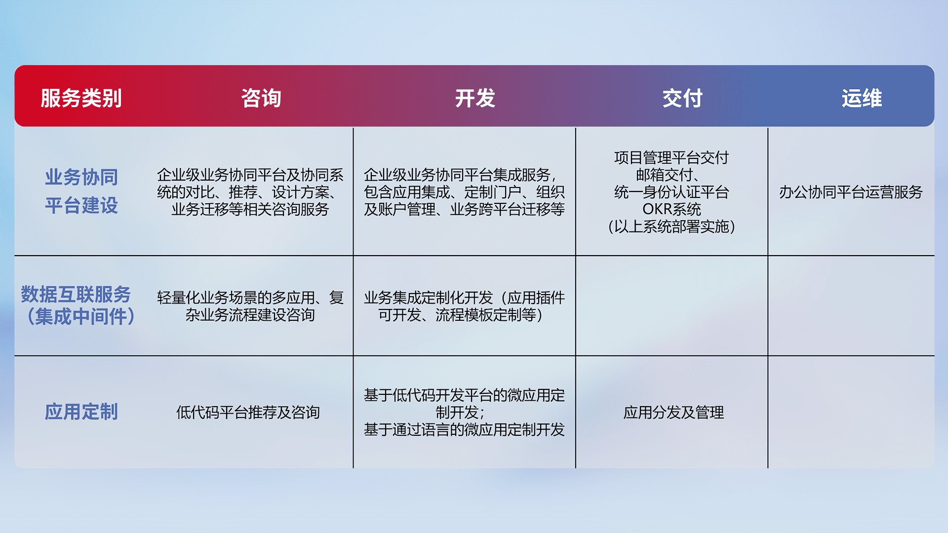 针对钉钉、、、、企微、、、、IDaas等平台级产品提供产品的规划、、方案、、、交付、、、、定制化开发等服务,,,实现如统一协同办公、、智能客户服务、、、混合会议管理、、、、智能数据查询、、等业务场景,,,,实现数字化转型。。